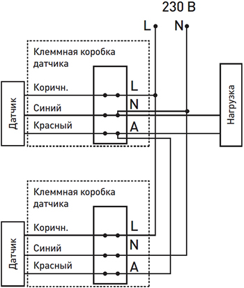 При таком подключении цепь нагрузки замыкается при срабатывании любого из датчиков.