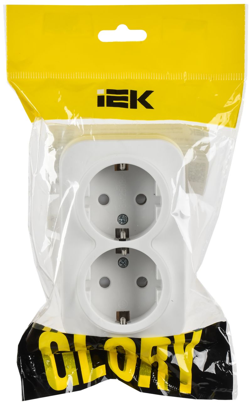 Розетка двухместная IEK РСш22-3-ХБм Glory (16 А, IP20) открытой установки, с заземлением и защитными шторками, белый матовый