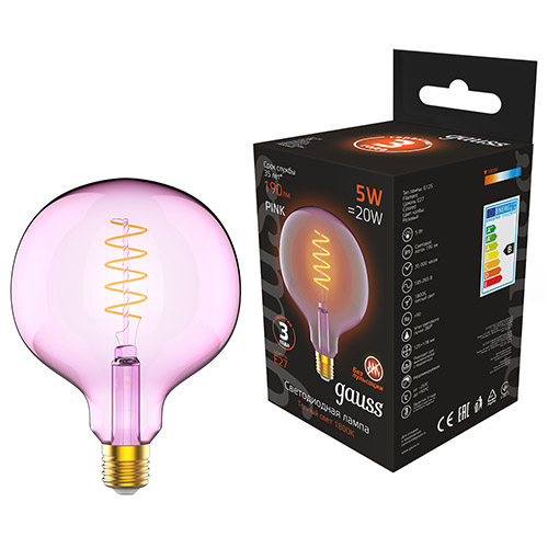 Лампа светодиодная Gauss Filament G125 5W 190lm 1800К Е27 Pink Flexible LED (5 Вт, 190 лм, розовая колба)