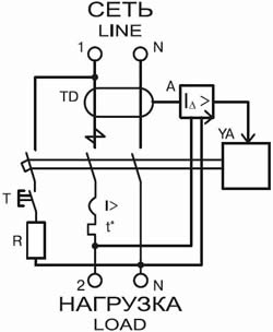 - Комбинированная схема с электронным модулем дифференциальной защиты и встроенным автоматическим выключателем.