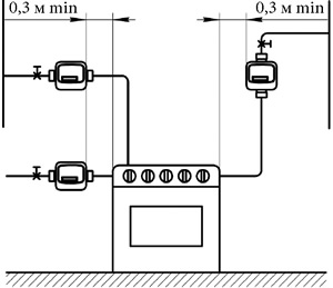 - Счетчик устанавливается на расстоянии (по радиусу) не менее 300 мм от бытовой газовой плиты (или варочной панели) и отопительного газоиспользующего оборудования (емкостного и проточного водонагревателя, котла, теплогенератора).
