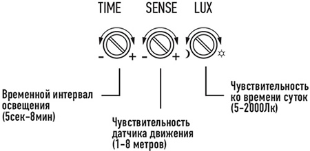 - Имеется возможность регулировки параметров датчика движения.